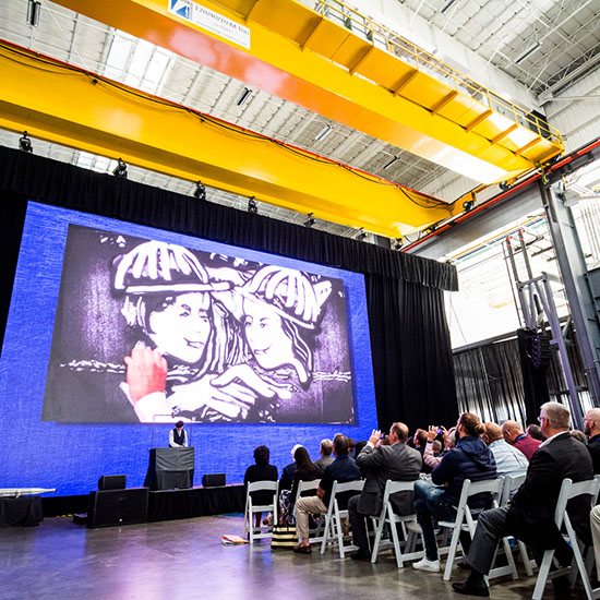 Incorporate your corporate social responsibility and modernize your event by limiting waste (printed schedule of events, paper decor and signage) and replacing with a digital version. They aren’t just replacing paper – this company (see below) used 4K panels on a track to “drop the curtain” (and jaws) on their grand unveiling!