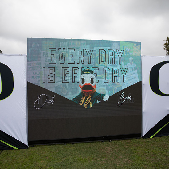 The big wow factor was the 16×30 foot LED wall! Here custom produced displays flowed across the screens. They both entertained and educated the guests in a unique way. Branded graphics, #tags, and more graced the screens encouraging team spirit. Go Ducks!