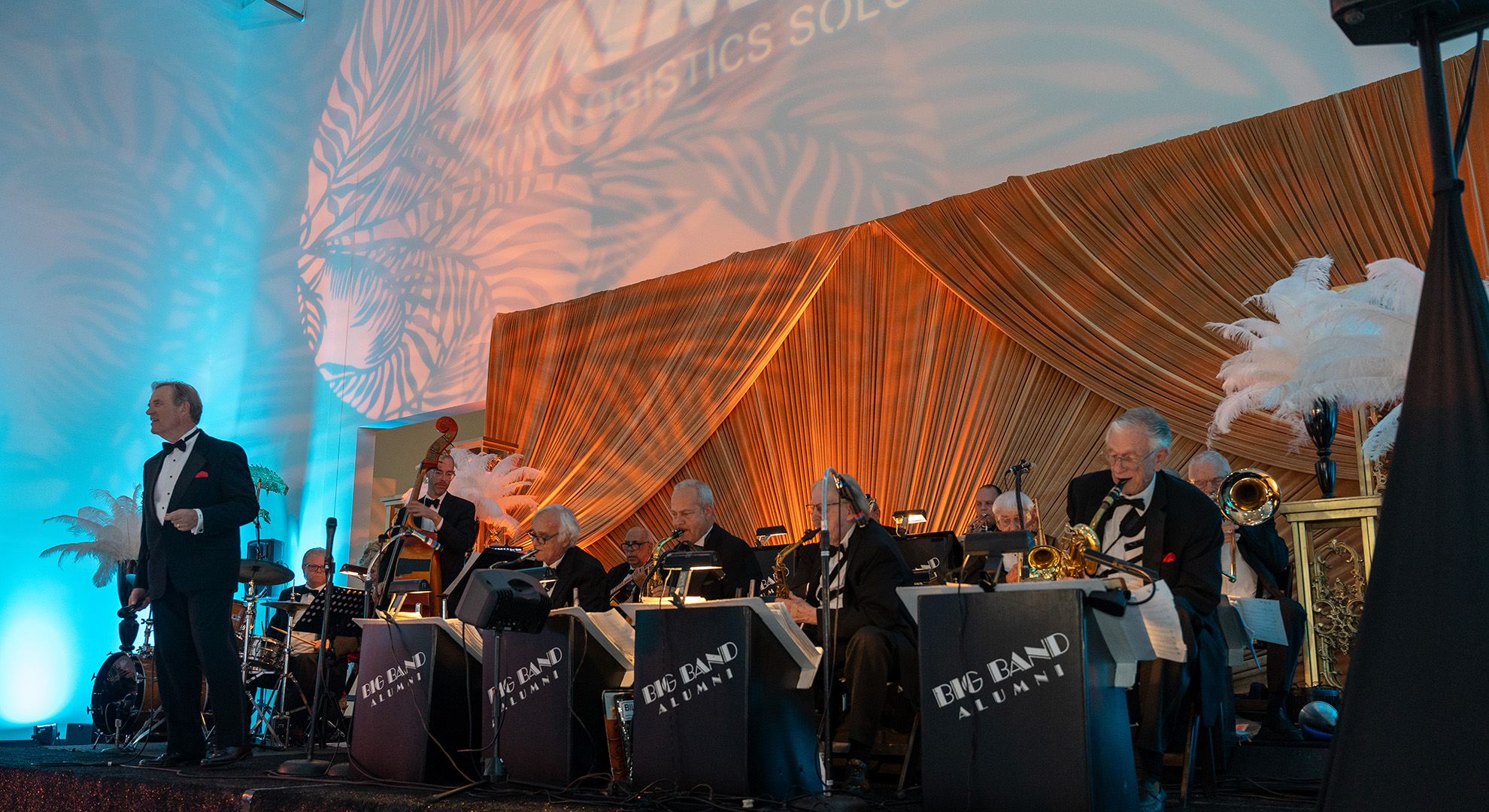Main Stage: A 13-piece Big Band and live vocalist performed under a champagne velvet “sunset” drape treatment, filling the warehouse with brassy, classic sounds.