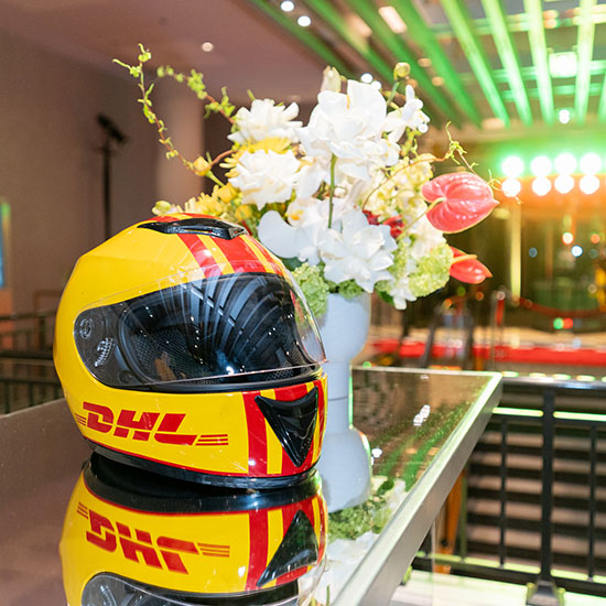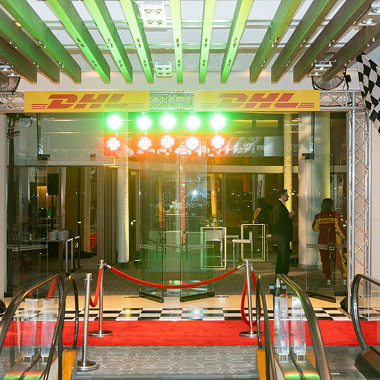 Inside, a metallic gold welcome booth boasted the motto “In the Fast Lane,” accompanied by DHL signage and branded GOBOs.