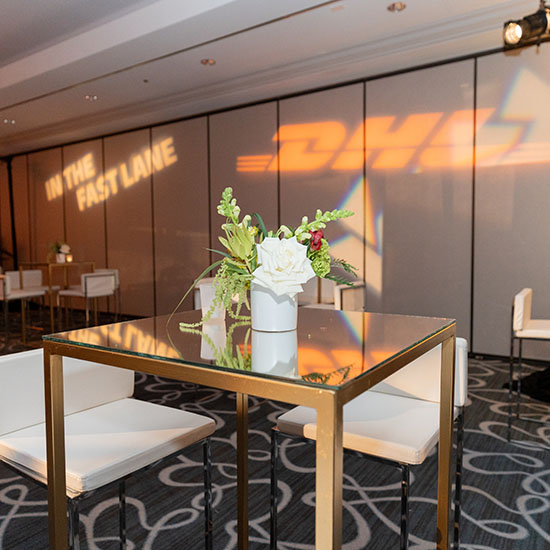 The entire reception would also be branded, from the GOBO lights displaying the DHL logo on the welcome booth’s backdrop to the couches in brand colors.