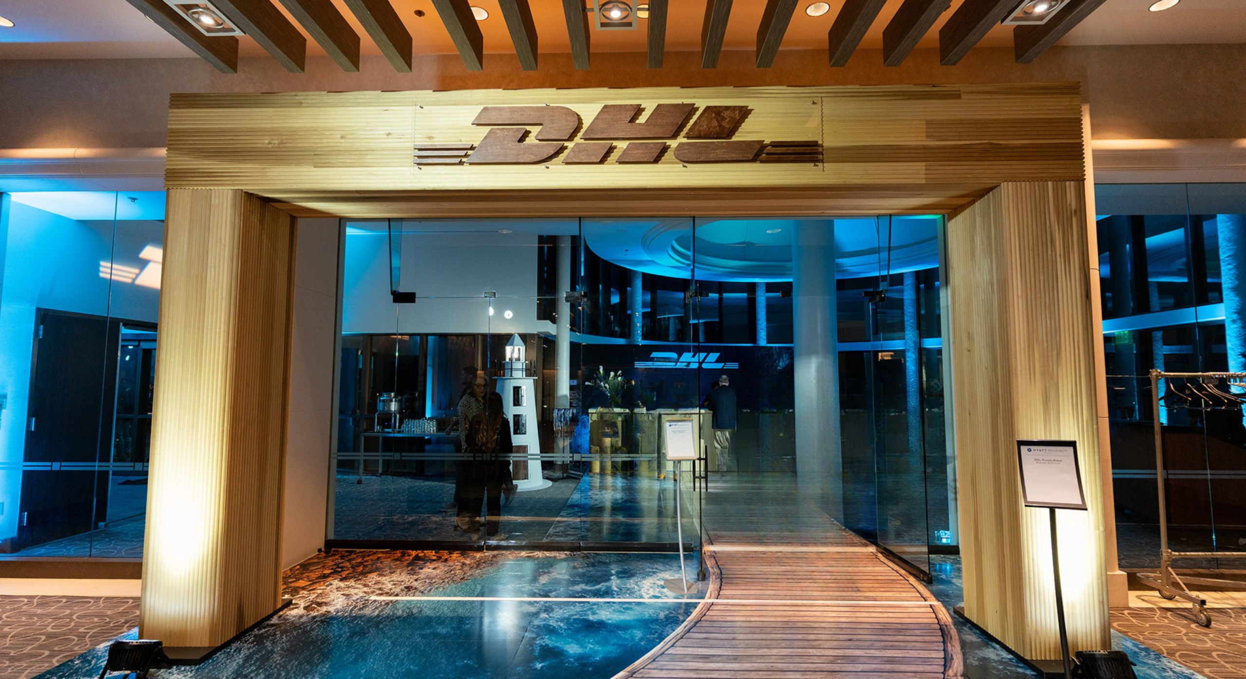 To signify the transition from the hotel to the DHL world, we installed a custom ocean-print vinyl walkway beneath a laser-cut wood DHL logo, creating the sensation of walking across the water to reach the event’s “inner harbor.”