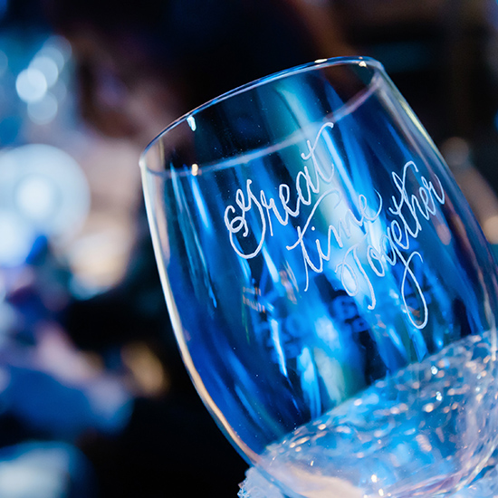 Guests enjoyed watching their message get etched into the wine glass before it was bubble wrapped and handed to them in a blue, branded gift bag as they left to enjoy again and again.