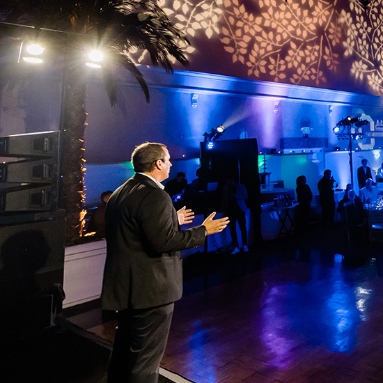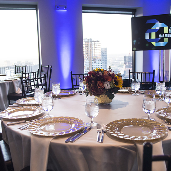 Because this party celebrated the company’s 20th anniversary, a branded logo was projected into the entrance.