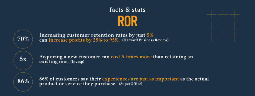 What is ROR? In event marketing and planning, ROR is a metric which tracks the development and nurturing of relationships with attendees, clients, partners, and employees through events. Utilizing data points such as attendance, revenue generated, attendee satisfaction, and brand perception, ROR can give you a well-rounded approach to analysis. Whereas ROI focuses on financial measurements, ROR focuses on a wide range of metrics with an emphasis on long term, intangible benefits.