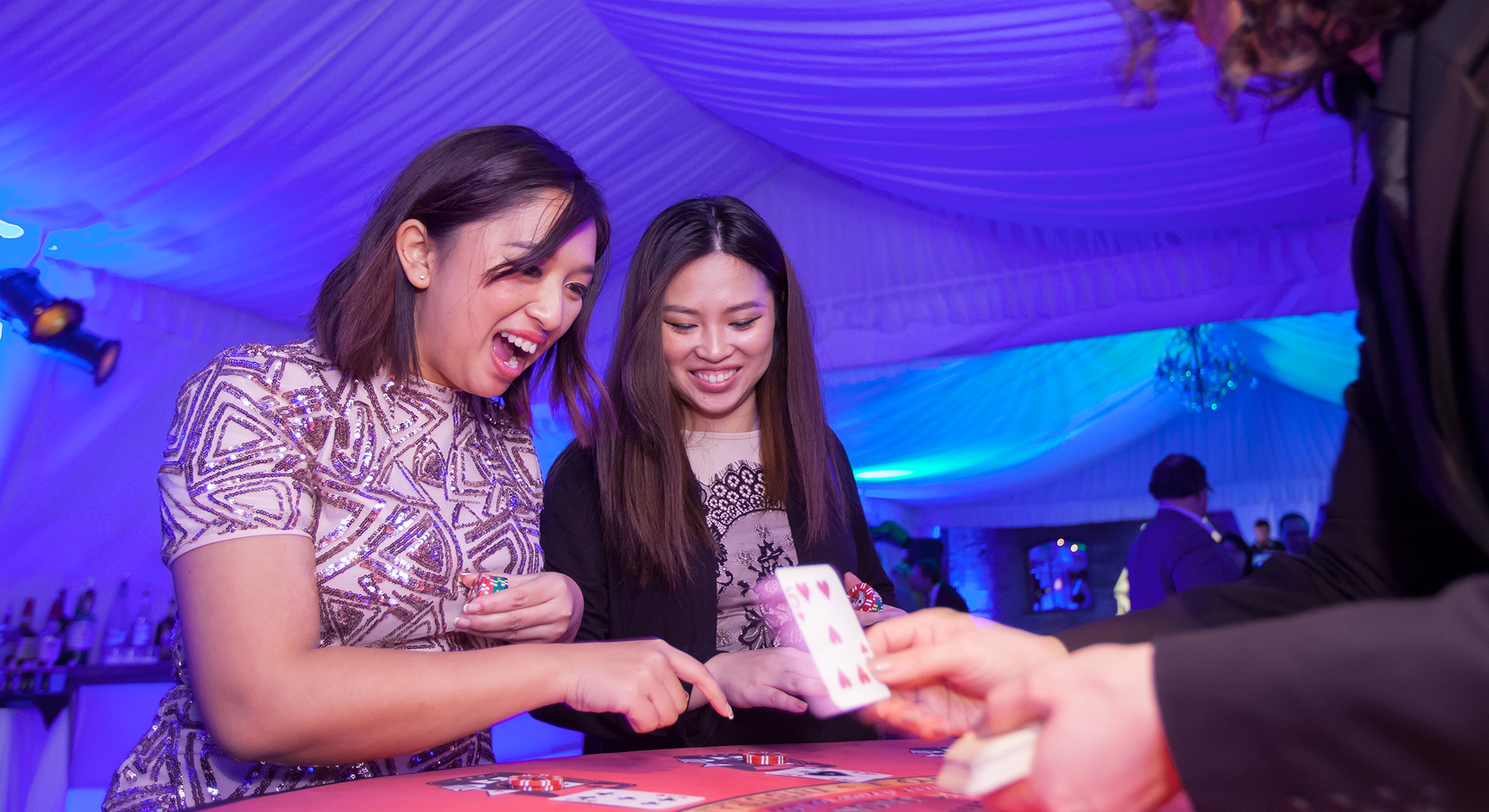 Event Solutions planned a grand gala with complete venue transformation, using creative decor, magical lighting (including gobos and uplights), and a full-service casino with 18 professional dealers. Entertainment was the focal point, featuring two jaw-dropping aerial silk dancers pouring champagne upon guest arrival and gravity-defying Cirque acts performing high above the dinner tables.
